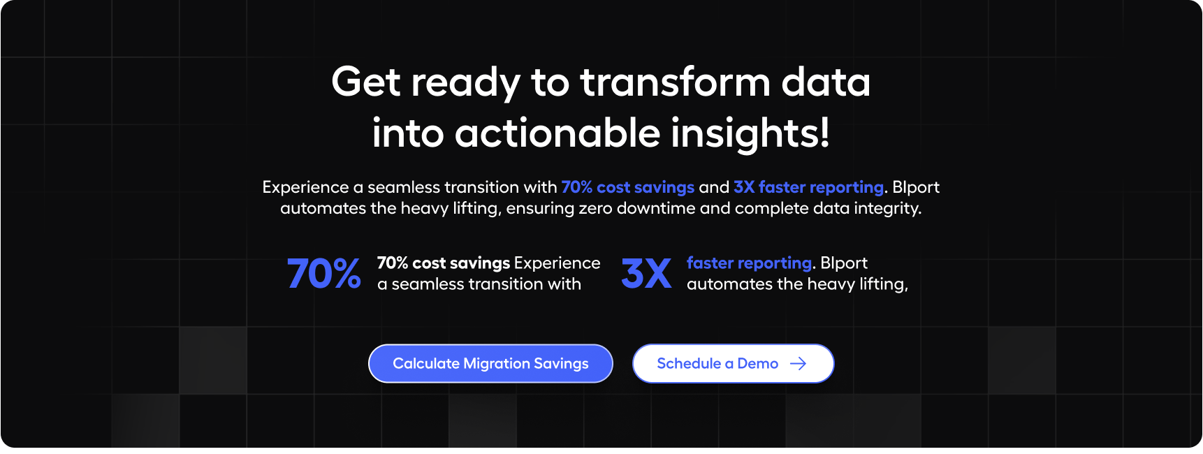 Experience a seamless transition with 70% cost savings and 3X faster reporting. BIport automates the heavy lifting, ensuring zero downtime and complete data integrity.