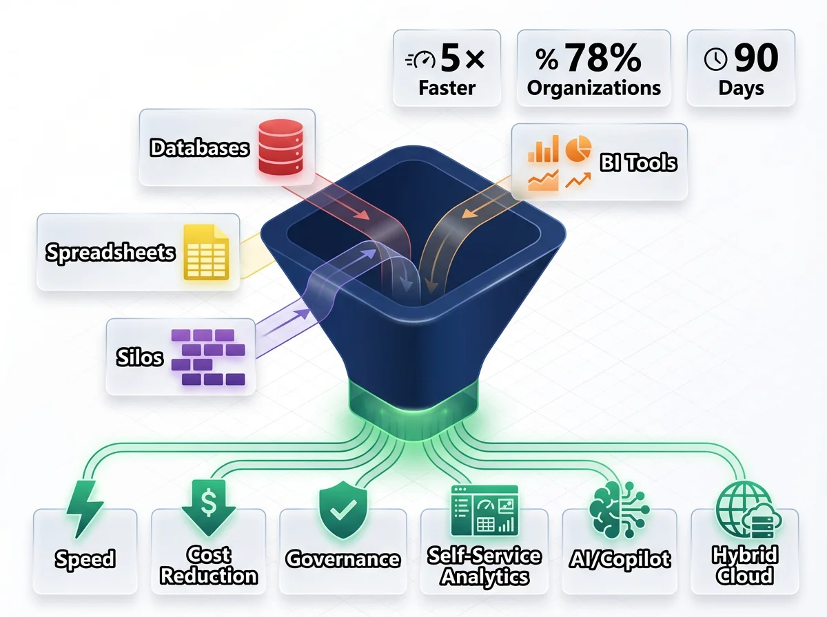 Microsoft Fabric solves this by unifying your entire analytics estate into one SaaS platform integrating OneLake storage, data engineering, real-time analytics, Power BI, and AI capabilities including Copilot.